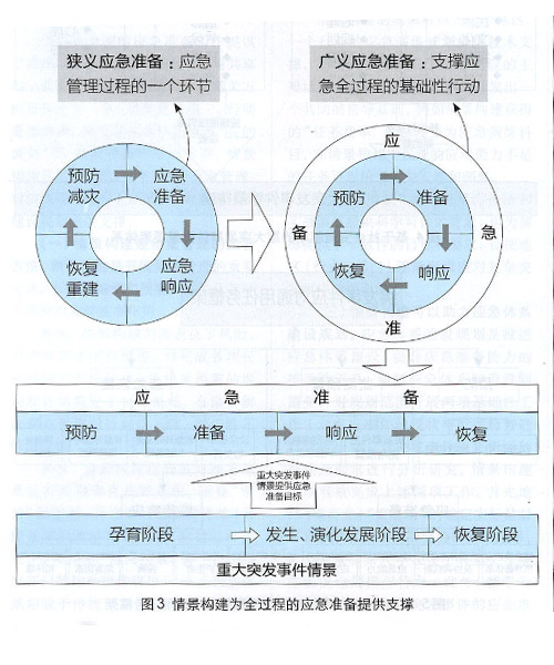 (一)全過程、多角度的情景分析。經(jīng)典的應(yīng)急管理理論,將應(yīng)急管理過程劃分為四個階段:預(yù)防、準(zhǔn)備、響應(yīng)和恢復(fù)。近十年應(yīng)急管理學(xué)界逐步認(rèn)識到應(yīng)急準(zhǔn)備的重要性,將其從單純一個過程環(huán)節(jié)提升為“支撐應(yīng)急全過程”的基礎(chǔ)性行動,進(jìn)而有了“廣義應(yīng)急準(zhǔn)備”和“狹義應(yīng)急準(zhǔn)備”兩個不同的概念,如圖3所示。