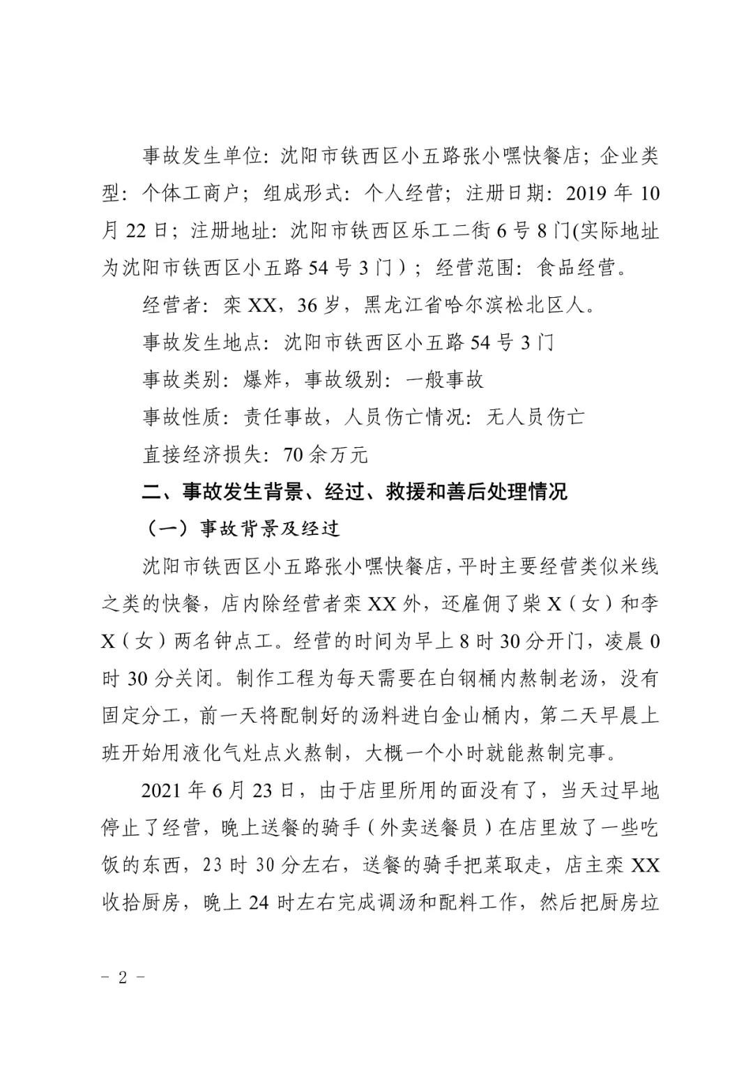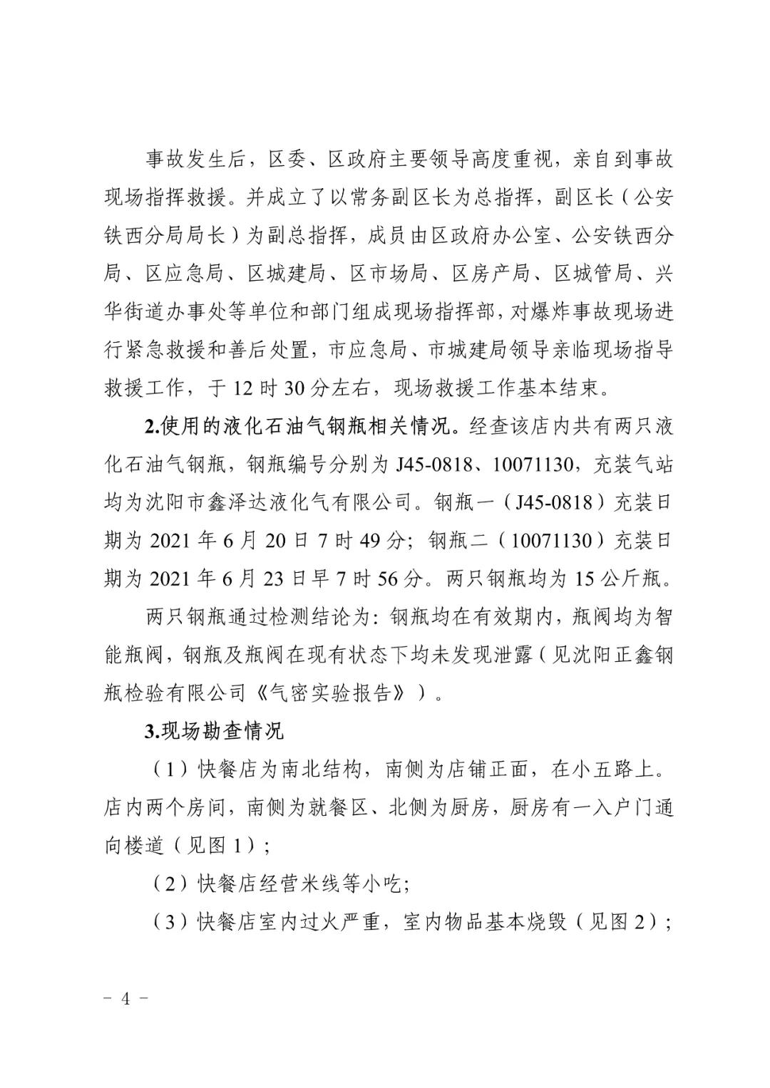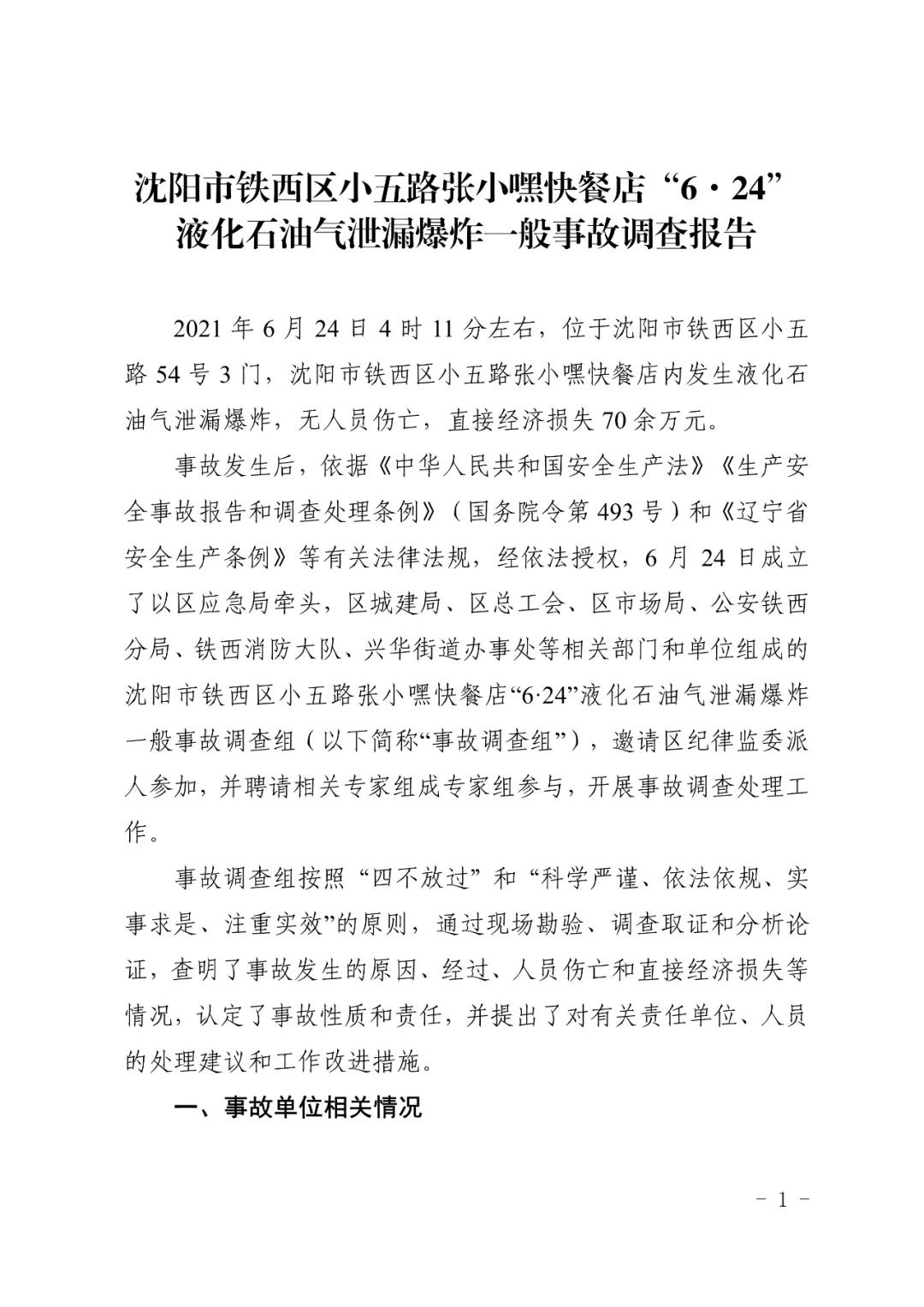 2021 年 6 月 24 日 4 時 11 分左右,位于沈陽市鐵西區(qū)小五路 54 號 3 門,沈陽市鐵西區(qū)小五路張小嘿快餐店內發(fā)生液化石油氣泄漏爆炸,無人員傷亡,直接經濟損失 70 余萬元。