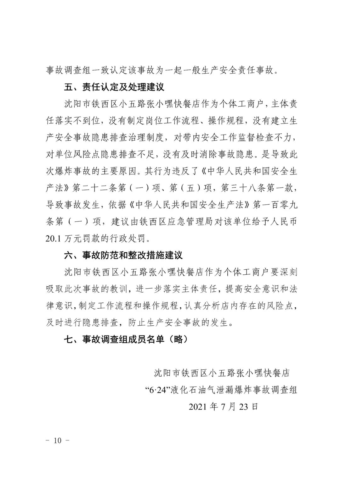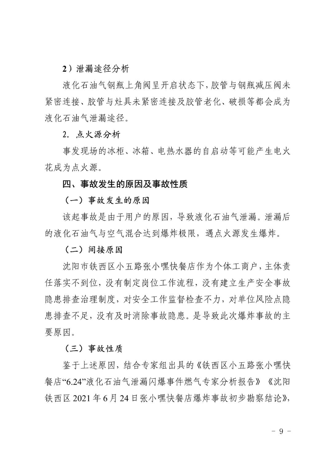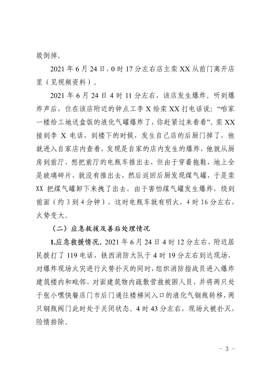 2021 年 6 月 24 日 4 時 11 分左右,位于沈陽市鐵西區(qū)小五路 54 號 3 門,沈陽市鐵西區(qū)小五路張小嘿快餐店內發(fā)生液化石油氣泄漏爆炸,無人員傷亡,直接經濟損失 70 余萬元。