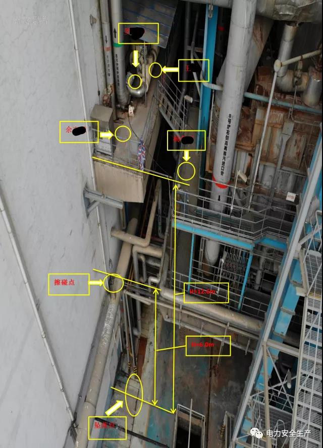 4.現(xiàn)場核查,主給水放水管已完全斷裂,下部水泥平臺被擊穿,臨近的滑動支架被高壓水汽吹脫至靠汽機房墻面,注膠槍與夾具脫開,吹至靠汽機房墻面。給水平臺頂端下部懸空冷再供熱母管保溫外護(hù)板有明顯碰撞變形痕跡,和余某某事故中躲避位置、事故后墜落位置對應(yīng)。