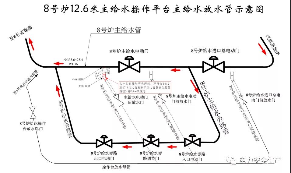 在 8 號機組鍋爐主給水管道放水管漏點處理過程中,放水管突然爆漏,高溫水汽大量噴出,導(dǎo)致工作現(xiàn)場3 人不同程度燙傷,其中1 人在躲避高溫水汽過程中從12.6 米作業(yè)平臺墜落至鍋爐0 米地面,經(jīng)搶救無效死亡;1人送醫(yī)救治8 天后死亡。