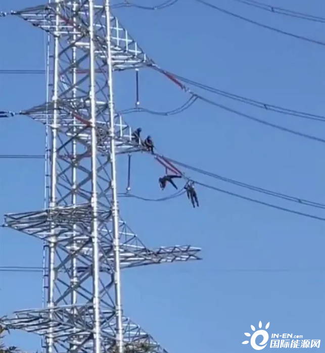 網(wǎng)友拍攝的視頻內(nèi)容顯示,在一道路附近的高壓線桿上,兩名人員的身體懸掛在線纜上一動不動,疑似發(fā)生觸電事故,一旁則是架設(shè)的高壓電力設(shè)施。極目新聞記者注意到,兩名人員身穿黑色衣服,頭戴安全帽,因事發(fā)地位于道路交叉口,附近來往行人和車輛較多,不時有市民在一旁圍觀。