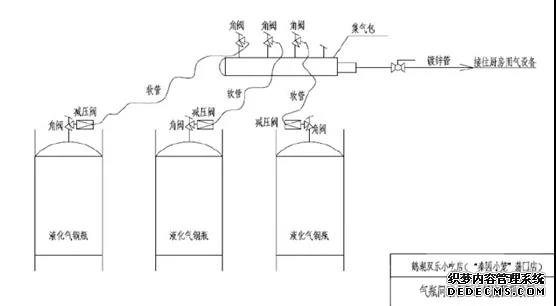 氣瓶間南北向?qū)?.5米,東西向長(zhǎng)6米。沿北墻由西向東依次放置冰箱一臺(tái)、50Kg空瓶5只(編號(hào)為1#、2#、3#、4#、8#);沿南墻由西向東依次設(shè)置油水分離器一套、冰箱一臺(tái)、50Kg液化石油氣鋼瓶3只(編號(hào)由南向北依次9#、6#、7#)。9#、6#、7#鋼瓶中的液化石油氣通過調(diào)壓閥、燃?xì)庀鹉z軟管連接至集氣包,由集氣包向二樓廚房間送氣。
