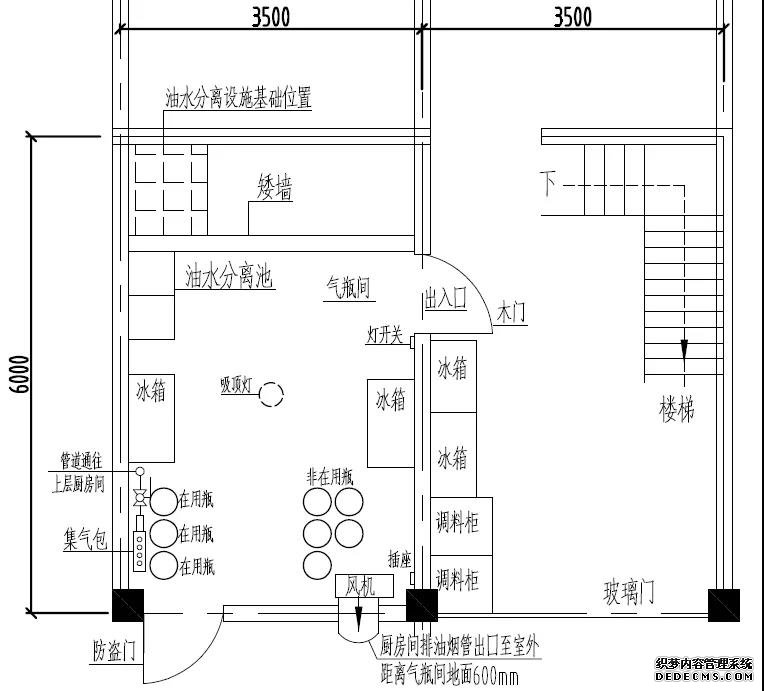 廚房間設(shè)置在氣瓶間樓上(東側(cè)建筑的二樓),南側(cè)由西往東依次擺放:雙眼炒灶、不銹鋼雙層工作臺(tái)、蒸煮爐、單頭矮仔爐、湯爐、頂上吊不銹鋼煙罩;東側(cè)由南向北依次擺放:蒸包子爐、不銹鋼水槽等。廚房間內(nèi)燃?xì)忮冧\鋼管從一樓氣瓶間西南角立管延伸至二樓廚房間,沿踢腳線敷設(shè)鍍鋅鋼管,管上裝有6個(gè)”三通”,通過“三通”和支管閥門連接燃?xì)庀鹉z軟管直供雙眼炒灶1臺(tái),其他燃器具依次由DN25鍍鋅鋼管(輸氣總管)經(jīng)“三通”及角閥與家用調(diào)壓器連接二次減壓后,分別通到蒸煮爐2臺(tái)、單頭矮仔爐2臺(tái)、湯爐1臺(tái)、蒸包子爐1臺(tái)使用。