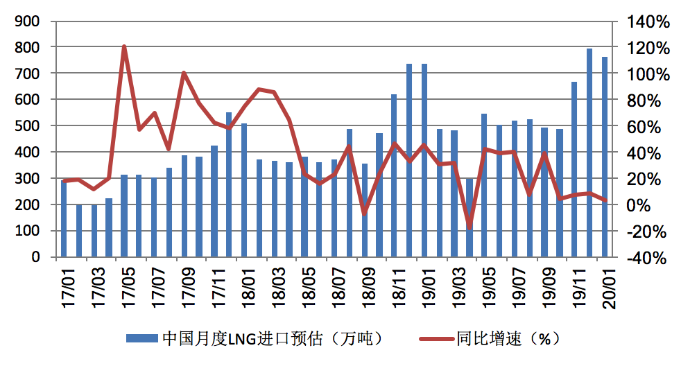 新華能源E-gas數(shù)據(jù)平臺的預(yù)測結(jié)果顯示,2020年1月份,中國LNG進(jìn)口量預(yù)計為763萬噸,較去年同期增長3.4%,較2019年12月減少3.9%。