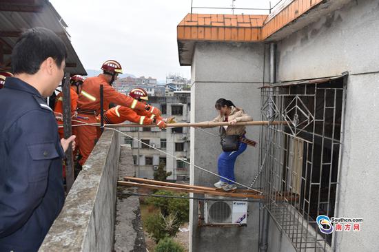 中隊(duì)指揮員仔細(xì)勘察現(xiàn)場周圍情況后,發(fā)現(xiàn)被困的一家人的樓層與相鄰的樓層只隔了1、2米的距離,于是決定從對(duì)面樓層將被困人員營救出來。消防官兵找來單杠梯和木板搭在被困人家的窗口,然后再將備好的腰帶扔到對(duì)面,讓他們系好,腰帶則用繩索在另外一邊固定。為了讓他們穩(wěn)住重心,防止摔倒,消防官兵又找來另外一條木棍架在窗與圍墻之間,讓他們可以扶著過來。消防官兵一邊穩(wěn)住被困人員的情緒,一邊謹(jǐn)慎得操作著,將被困人員身上的保險(xiǎn)緊緊拴牢,防止意外事故的發(fā)生。待被困人員快到圍墻邊,消防官兵則立即用手拉住他們,抱了上來。在經(jīng)過讓人窒息的20多分鐘后,一家5口終于有驚無險(xiǎn)的被救了出來。