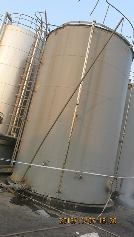 | 2013年10月份 | 九江天賜公司員工巡檢時就發(fā)現(xiàn)電解質(zhì)二期廢酸儲罐區(qū)A罐出現(xiàn)液位計穿孔等問題,采取了臨時措施堵漏。 | |